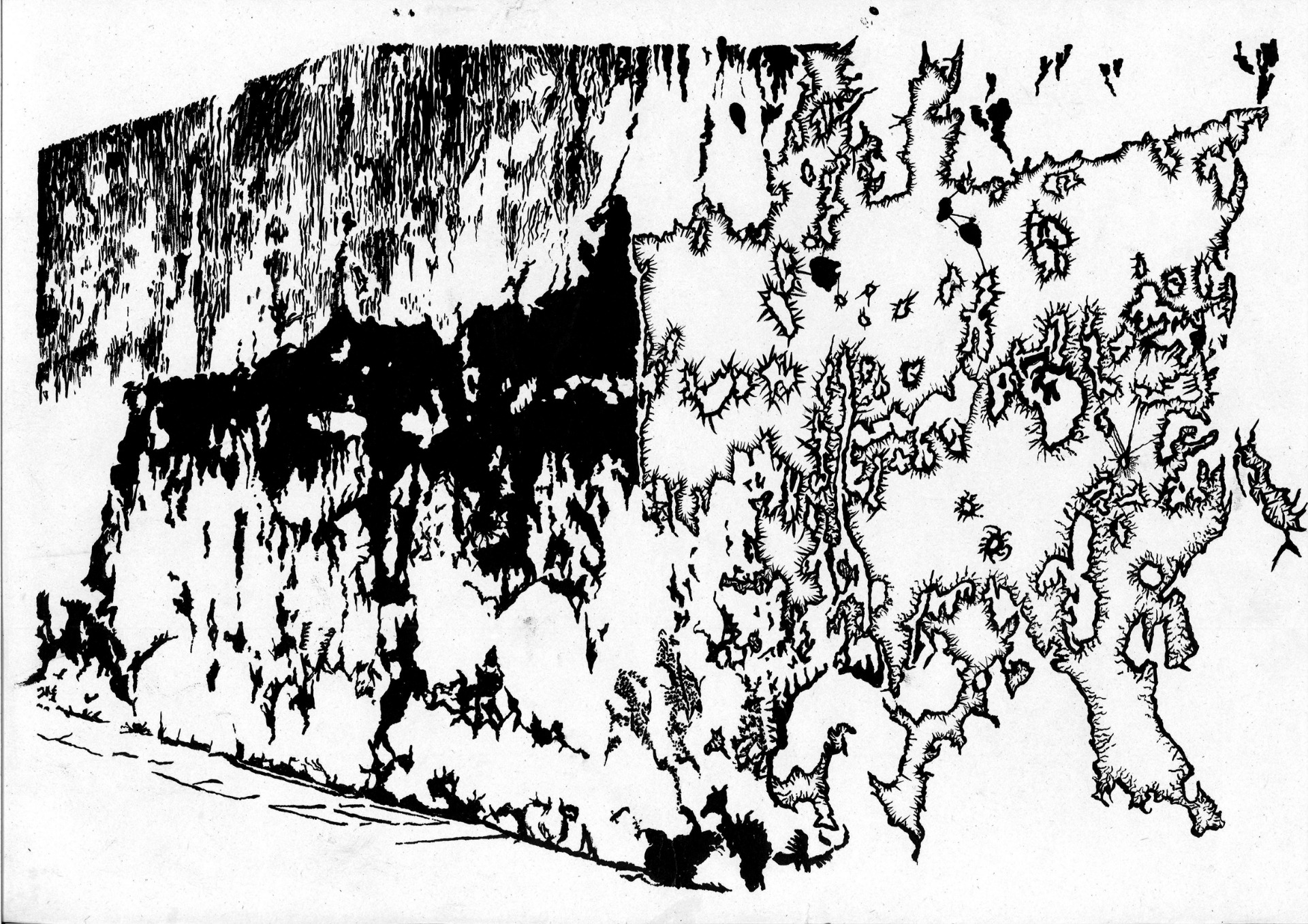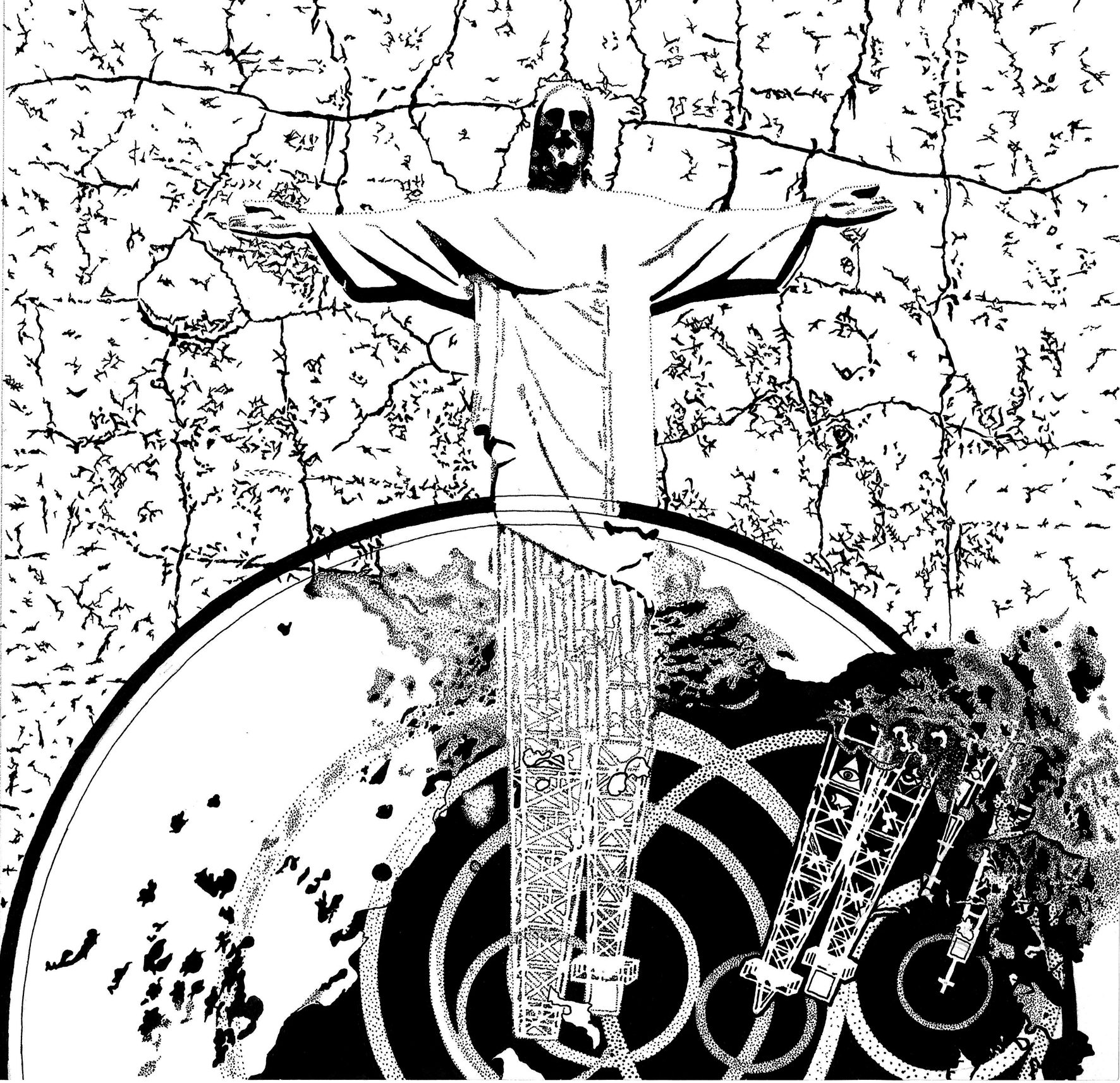 The title of the record was going to be "El Aire Libre Fuera de Los Dientes del Monstruo Tirano y Canibal", in English: (In) the Free Air/Freedom, Away from the Teeth of a Tyrannical and Cannibalistic Monster", so I wanted to express both the manifestations of that tyranny and the outbreak from it's teeth. Several parts of the drawing are based on photographs that I had taken from various spots: basilique Marie-Reine du Monde in Montreal, some underpass walls and choral-like formations on a seaside in Cuba.
