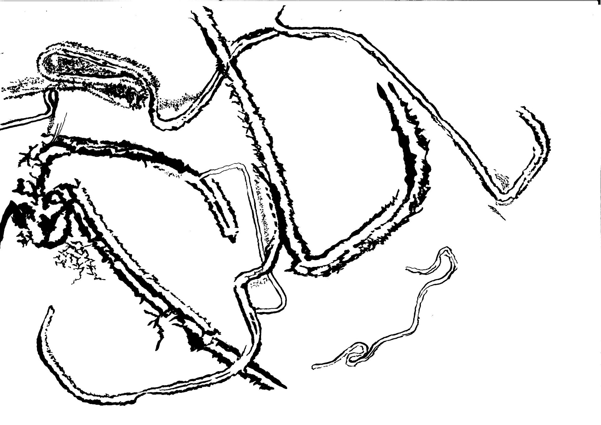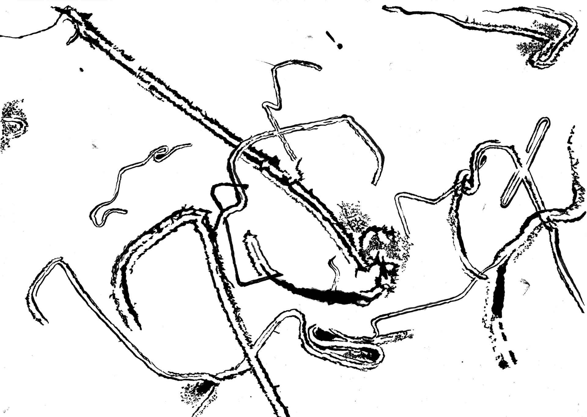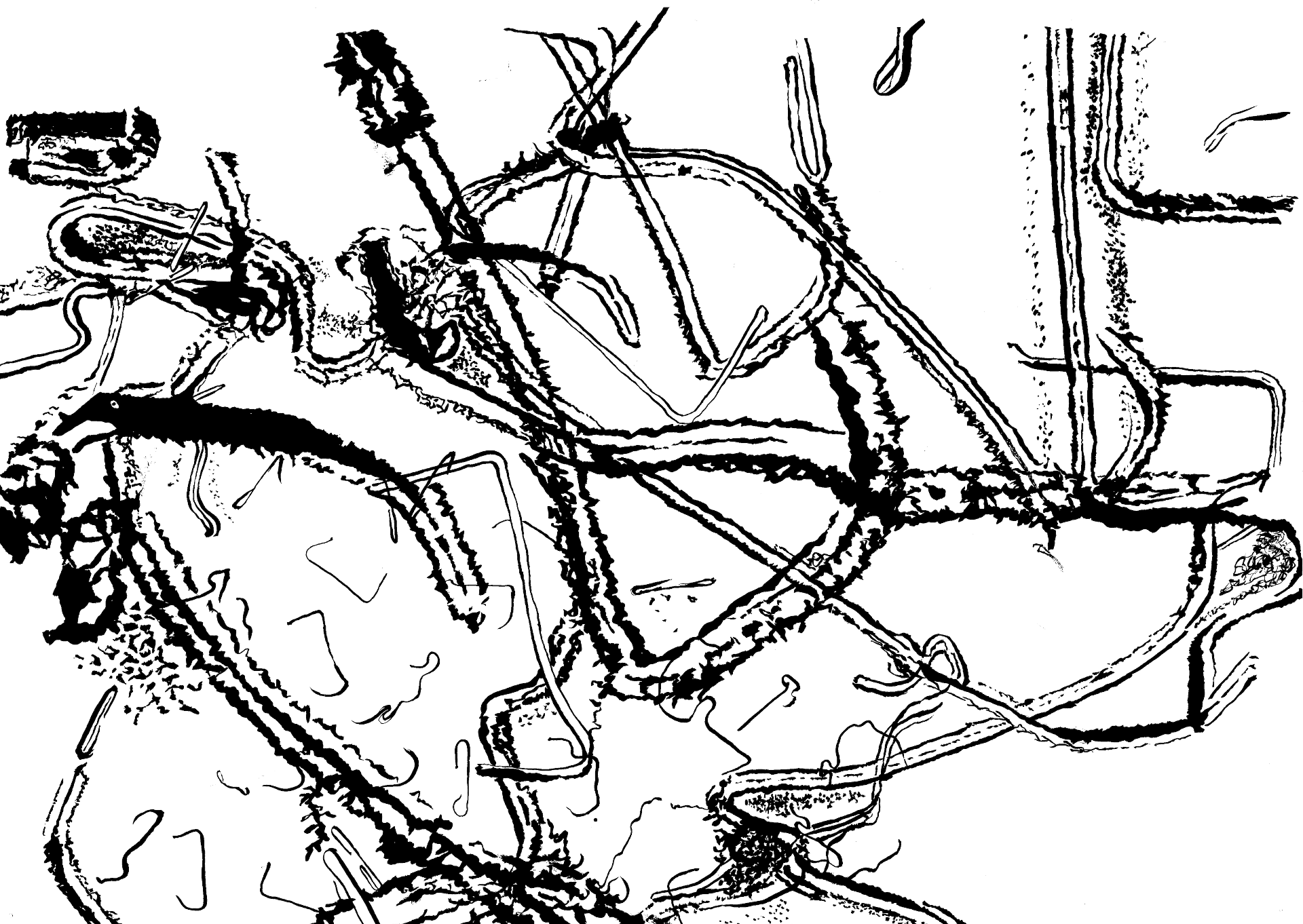 Malformed staples made with a broken stapler, magnified and photocopied multiple times, then chosen ones drawn on a light table.